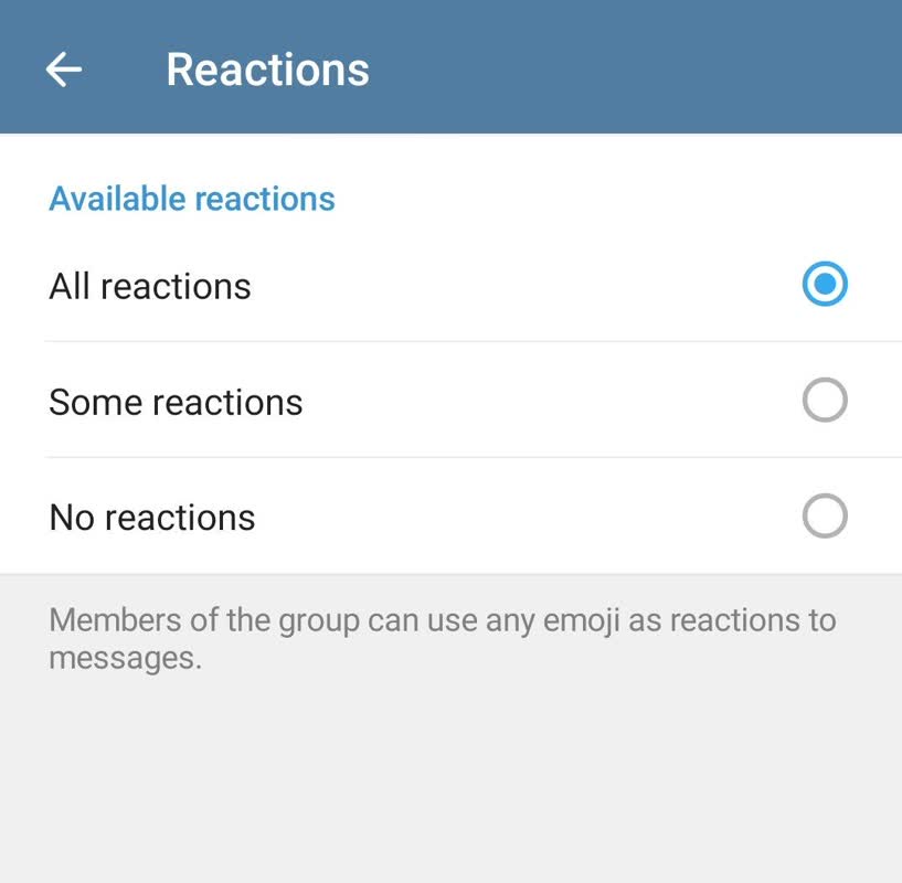 در ری اکشن ها با سه گزینه آشنا می شوید که اولی همه ی ری اکشن هاست (All reactions)و یعنی کاربران می توانند تمام ری اکشن هارا بدون محدودیت بگذارند.
